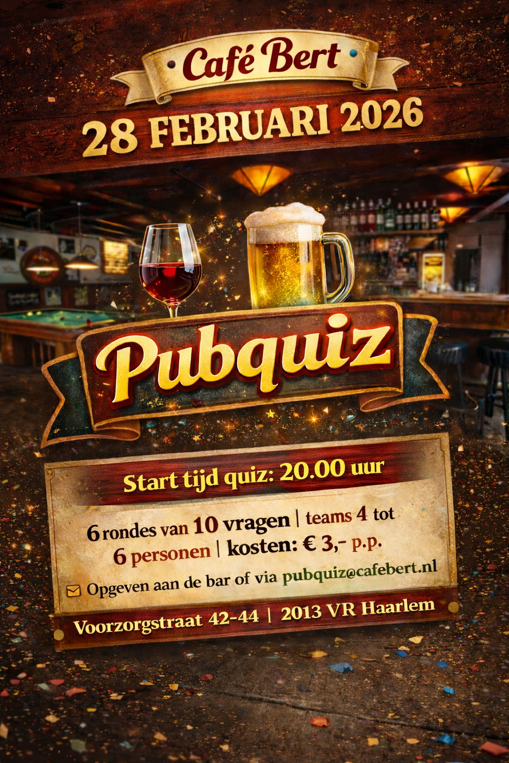 Wil jij op de hoogte worden gehouden van onze pub quiz. Stuur ons een mail via info@cafebert.nl en laat je naam e-mail en telefoon nummer achter dan houden wij jou op de hoogte wanneer wij weer een pub quiz organiseren.